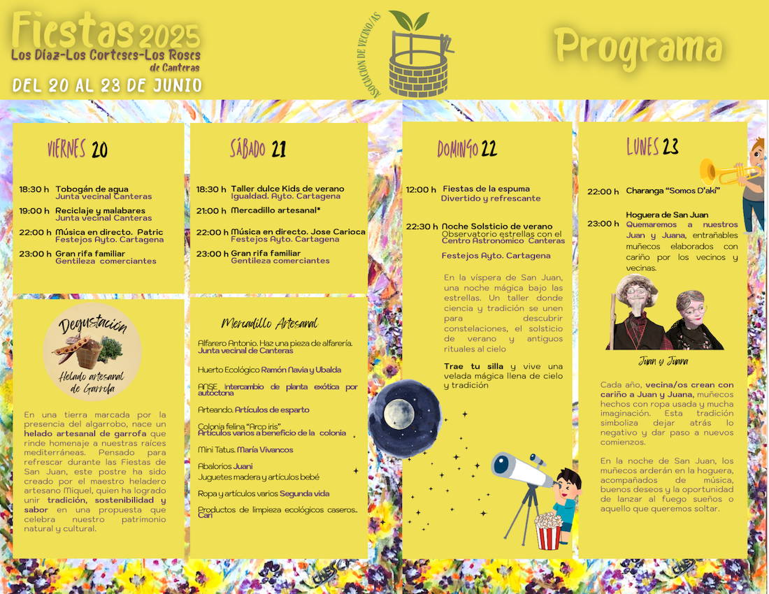 Comienzan esta tarde y se prolongarán hasta el lunes, cuando se celebré la popular hogareta con la quema de los muñecos de Juan y Juana que elaboraron los vecinos con ropa usada. El programa de actos incluye también ercadillo artesanal, fiesta d ela espuma, música y un taller de de observación del cielo.