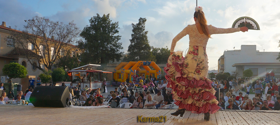 La floreada celebración organizada por la comisión de fiestas en la plaza de la Virgen de los Dolores atrajo a varios cientos de personas para disfrutar de unas propuestas, que incluyeron el baile por sevillanas de Rocío de la Cova y sus alumnas, además de alegre música flamenca de 'Calle del aire'. Hoy es el turno para la floreada fiesta en Barriada de Hispanoamérica.