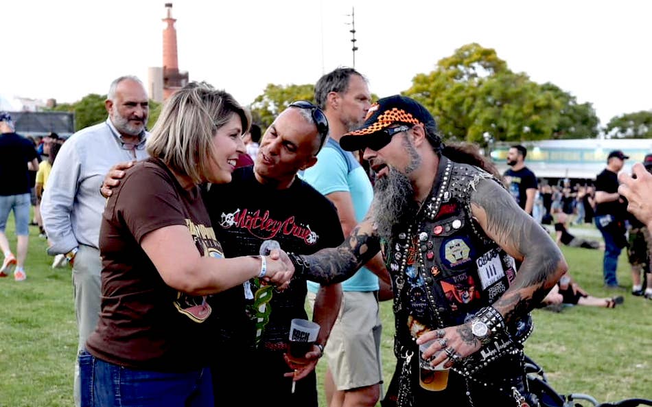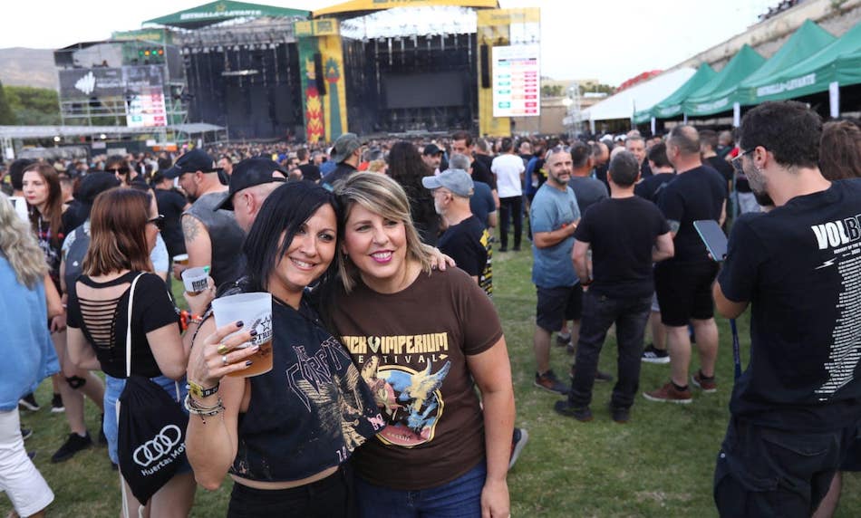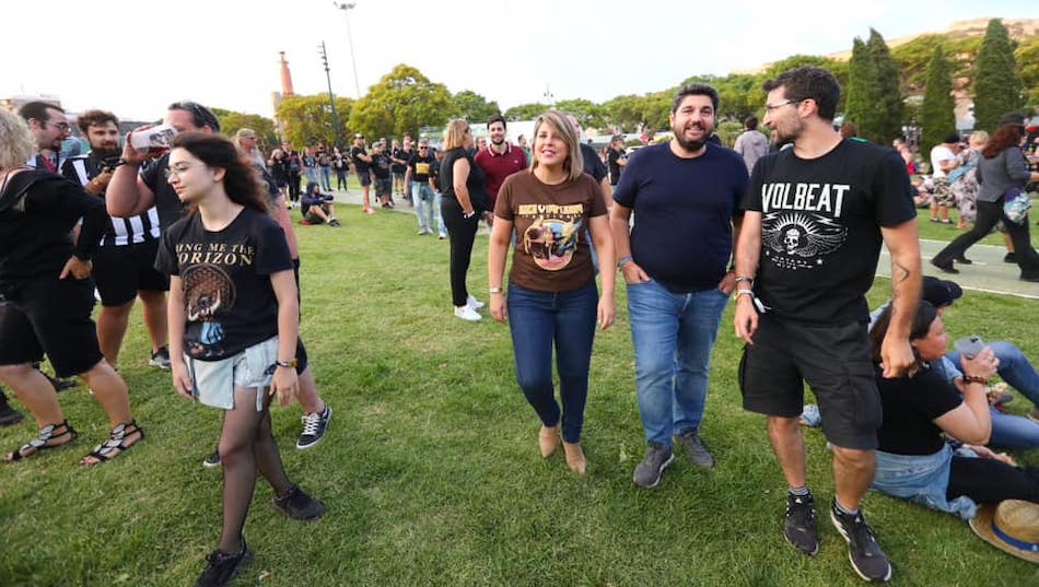 El primer día de 'Rock Imperium Festival' atrajo también a la alcaldesa, Noelia Arroyo, y al presidente regional, Fernando López Miras, a quien se observa representando con su mano el típico gesto de los rockeros y del 'heavy metal'.