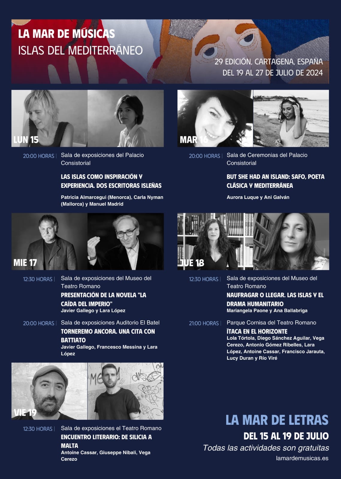 Por otra parte, el festival comienza este lunes su sección literaria La Mar de Letras. Será con dos invitadas de las Islas Baleares en un coloquio titulado ‘Las islas como inspiración y experiencia’. Abierto a todo los públicos comenzará a las 20 horas en el Palacio Consistorial. Participan la investigadora y escritora especializada en literatura de viajes Patricia Almarcegui (Menorca); y la escritora y directora de escena Carla Nyman (Mallorca). Ambas conversarán con el periodista Manuel Madrid (LA VERDAD). Reflexionarán sobre el carácter isleño y la creatividad, a la vez que nos darán a conocer sus últimos trabajos literarios.