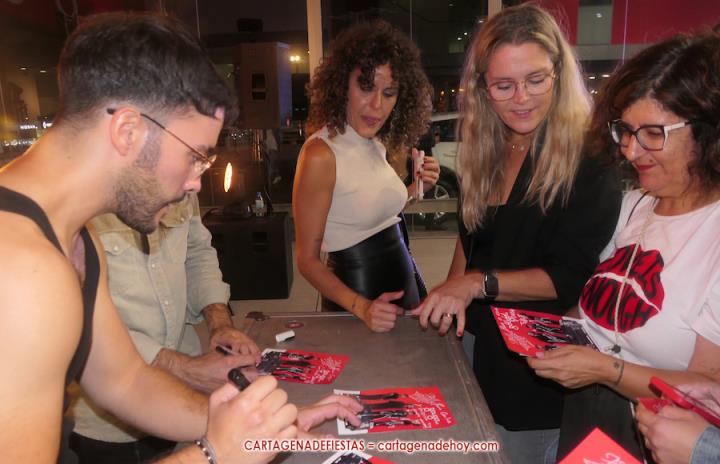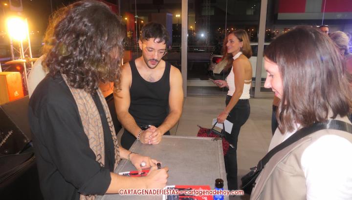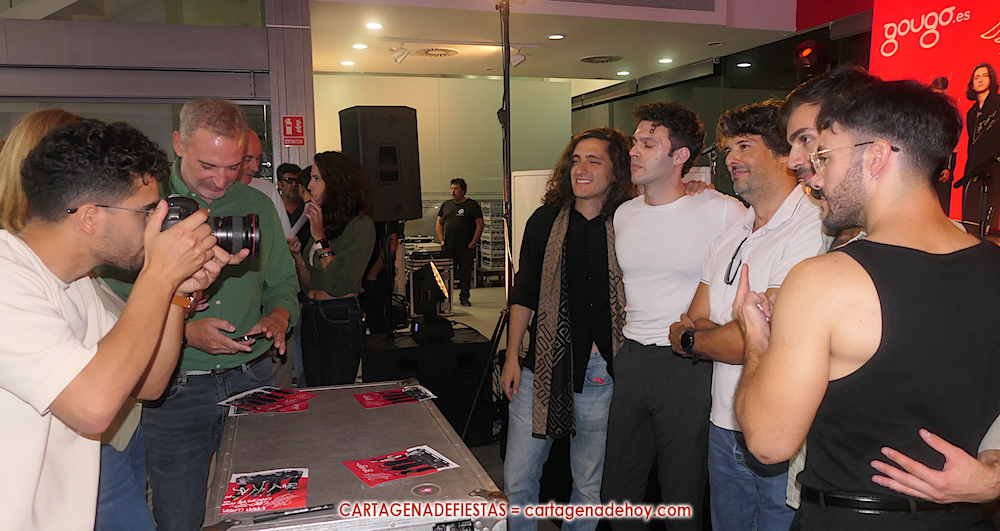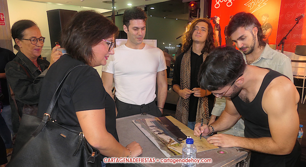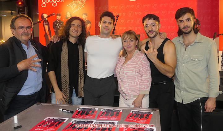 José Ángel Mercader, Antonio García, Dani Sánchez y Pepe Esteban (por el orden de izquierda a derecha de la foto superior), quienes en breve pondrán fin a una gira con 50 escalas, han estado en el novedoso 'Gougo' de Cartagena para recoger las nuevas furgonetas, ofrecer dos canciones en directo y demostrar una gran empatía con todos los presentes, a quienes firmaron un sinfín de autógrafos, además de posar con ellos para unas fotografías muy especiales con la banda de moda del rock español.