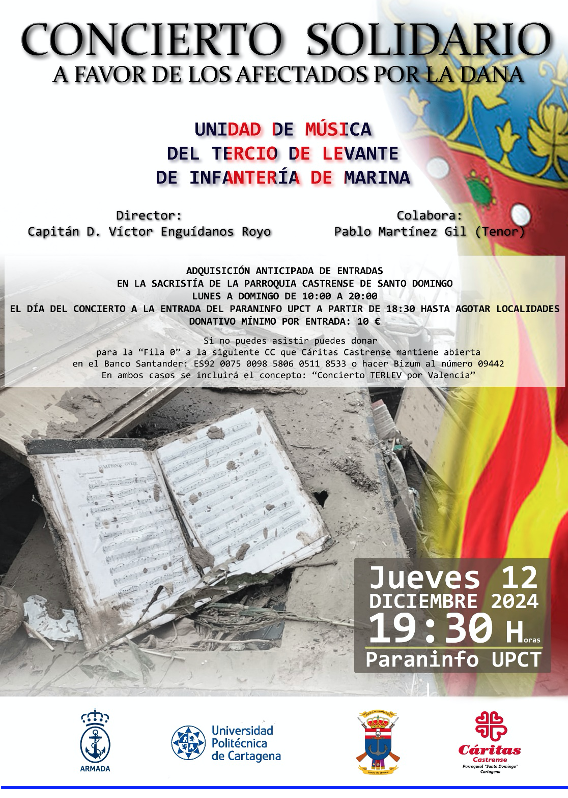 La unidad de música del Tercio de Levante de Infantería de Marina ofrecerá una actuación este jueves en el paraningo de la Universidad Politécnica de Cartagena, bajo la dirección del capitán Víctor Enguíanos royo, en colaboación con el tenor Pablo Martínez Gil. El dinero recaudado tendrá como destino ayudar a las personas que han sufrido las riadas que se produjeron en octubre y a reconstruir las localidades arrasadas de la comunidad valenciana y Letur (Albacete). Venta anticipada de entradas en la parroquia de Santo Domingo.