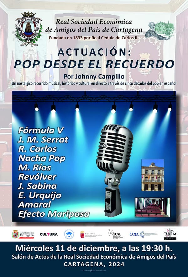 Es el título de la actuación que esta tarde acoge el salón de actos de la Real Sociedad Económica de Amigos del País, sita en la calle del Aire de Cartagnea,a cargo de Johnny Campillo, quien efectuará un recorrido musical por artitas y bandas de cinco décadas de la música española. Entrada gratuita.