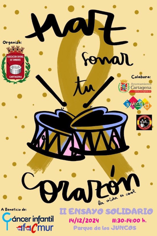La Asociación Juvenil de Tambores ‘Quillo’ celebra el próximo sábado 14 de diciembre, desde las 11:30, en el Parque de los Juncos un ensayo solidario a beneficio de AFACMUR, Asociación de Familiares de niños con Cáncer de la Región de Murcia cuya misión es la de mejorar la vida de niños y adolescentes afectados de cáncer, y sus familias, mediante apoyo y acompañamiento psicosocial.