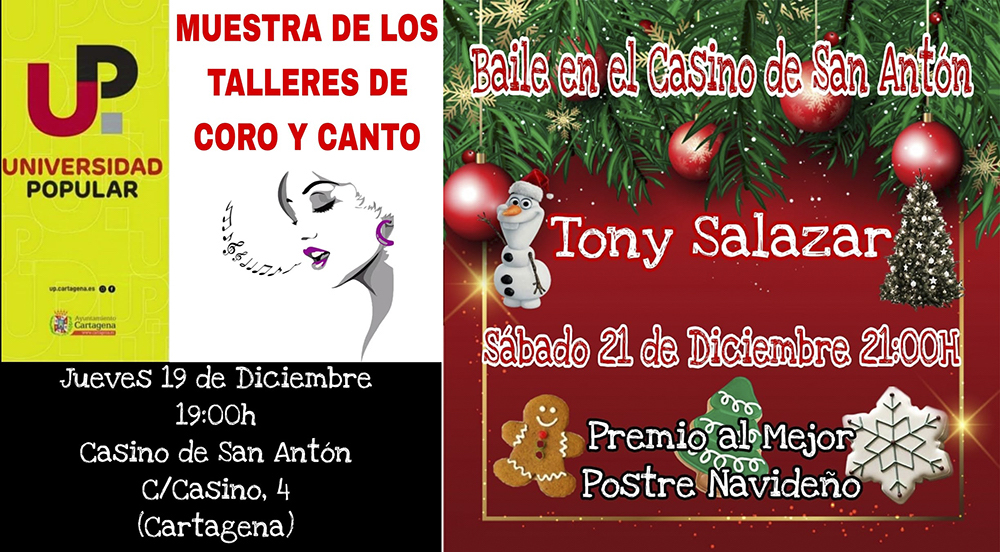 Este jueves acogerá una muestra de talleres de coro y canto que organiza en la tarde del jueves, que organiza la Universidad Popular, mientras que el sábado hay noche de baile con la música de Tony Salazar, en una velada navideña en la que será premiado el mejor postre.