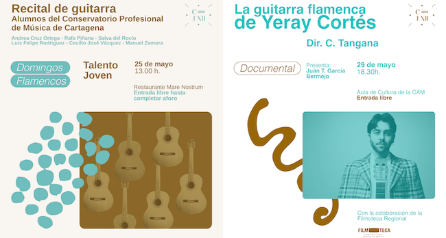 La peña flamenca 'Antonio Piñana' de Cartagena anuncia la celebración en mayo de un domingo flamenco con alumnos del Conservatorio de Música en el restaurante Mare Nostrum (día 25) y de la proyección de la película 'La guitarra de Yeray Cortés' en el aula de la Fundación de la CAM (día 29). La entrada es gratuita en ambos eventos.