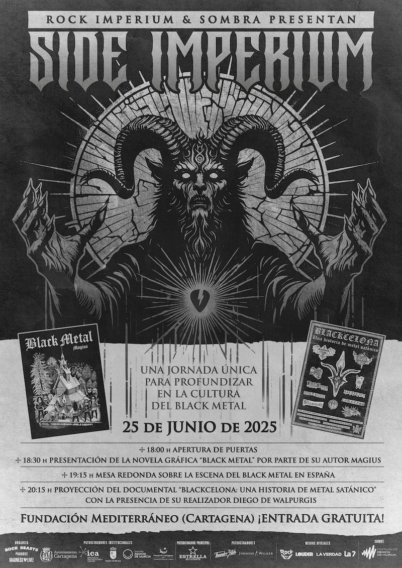 El Rock Imperium Festival, que cuenta con el patrocinio del Ayuntamiento de Cartagena, comienza a desvelar su programa de actividades paralelas, titulado Side Imperium, para la edición de 2025, que se celebrará del 26 al 29 de junio en el recinto situado en la Cuesta del Batel. De esta manera, un día antes, el 25 de junio, tras el éxito de las propuestas realizadas el pasado año, el certamen y el festival de cine fantástico europeo Sombra, han puesto en marcha una jornada dedicada a la cultural del black metal, uno de los géneros más extremos y fascinantes de la música contemporánea. Esta se realizará en la Fundación Mediterráneo, a partir de las 18:00 horas, con entrada libre, hasta completar aforo.