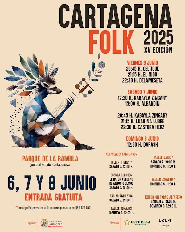 El Festival Cartagena Folk, organizado por el Ayuntamiento de Cartagena, desvela los horarios y la programación completa para su XV edición, que se celebrará del 6 al 8 de junio en el Parque de la Rambla con música en directo, una feria gastronómica y actividades para toda la familia. De esta manera, el certamen, con entrada libre, volverá a situar al municipio en el epicentro de la música de reelaboración tradicional del Levante español. El programa detallado, así como la inscripción de los talleres, está disponible en www.cartagena.es