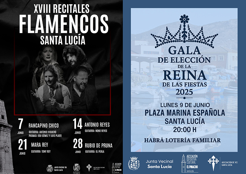 El cantaor de Chiclana de la Frontera estará en Santa Lucía acompañada por Antonio Higuero en la guitarra y por Edu Gómez y Luis Pijote a las palmas. El lunes, la elección de la reina festera incluirá una rifa familiar. Comenzará a las 20 horas en la plaza de la Marina Española.