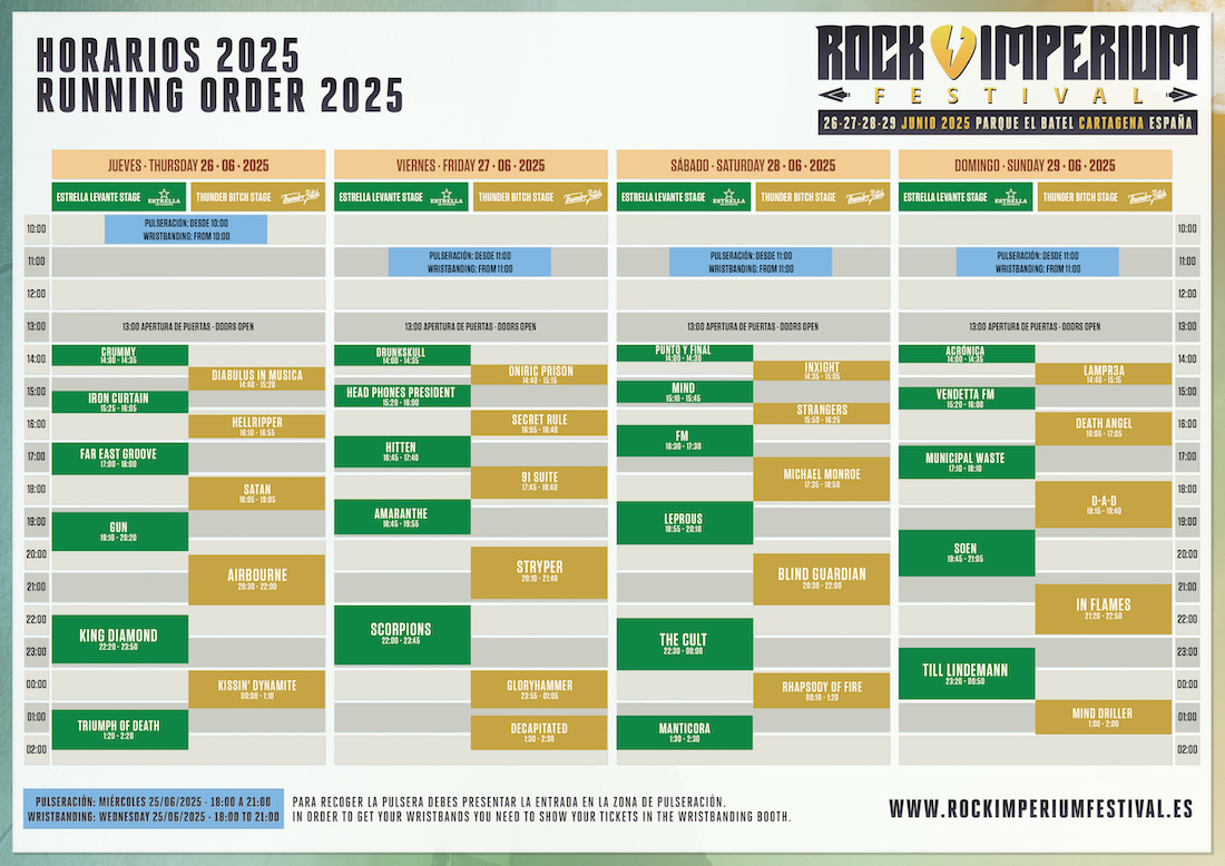 Entre las citas más esperadas por el público destacan la del jueves 26 de junio, día de arranque del certamen, cuando el escenario Estrella Levante Stage recibirá al carismático King Diamond y su banda a las 22:20 horas. El viernes 27, a las 22:00 horas, este mismo espacio contará con los míticos Scorpions, quienes regresan a Cartagena después de hacer vibrar a los asistentes de la primera edición del certamen en 2022.