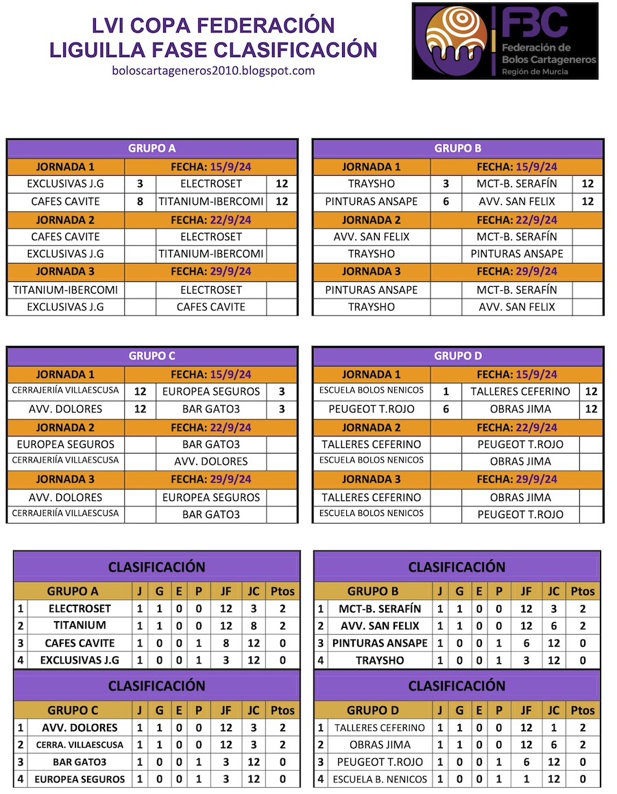 Tras el parón veraniego, los bolos cartageneros regresan con la Copa Federación, estrenando un nuevo formato. La competición comienza con una fase de liguilla, compuesta por 4 grupos de 4 equipos cada uno. Los dos primeros clasificados de cada grupo avanzarán a la fase final, que se jugará a eliminación directa. La jornada no dejó empate alguno, pero sí varias sorpresas.