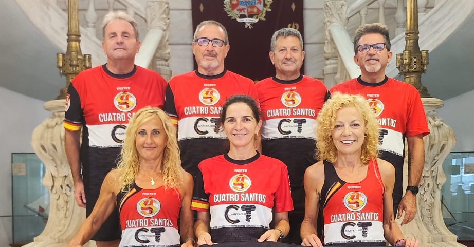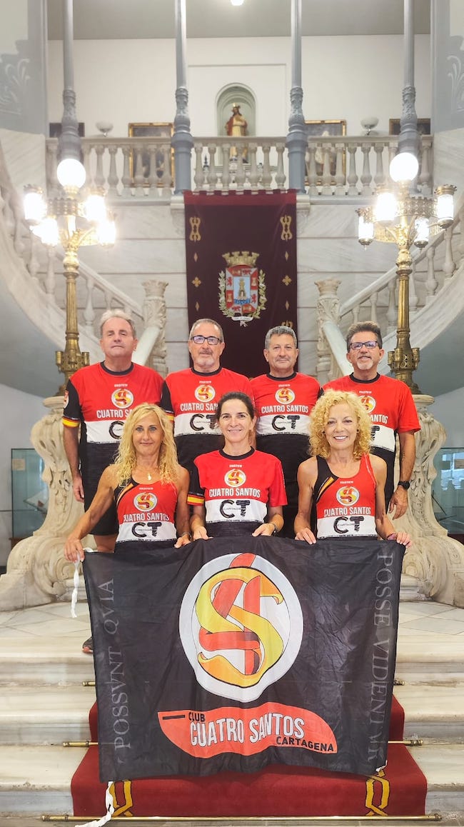 El club Cuatro Santos desplazará a siete de sus corredores para participar en la prueba 'Generali Munchen Maratón', que tendrá lugar el domingo 13 de octubre y que tendrá su meta en el estadio olímpico. En la imagen, los siete corredores cartageneros en el Palacio Consistorial.