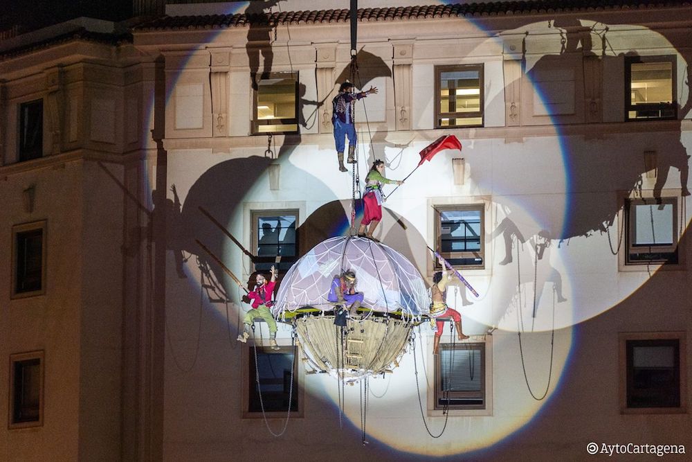 Luz y color que llegaron por aire, de la mano del espectáculo de Peter Pan, Wendy y Campanilla, surcando el cielo cartagenero para llegar hasta la plaza del Ayuntamiento, donde cientos de personas disfrutaron en familia de las acrobacias de estos personajes de cuento.