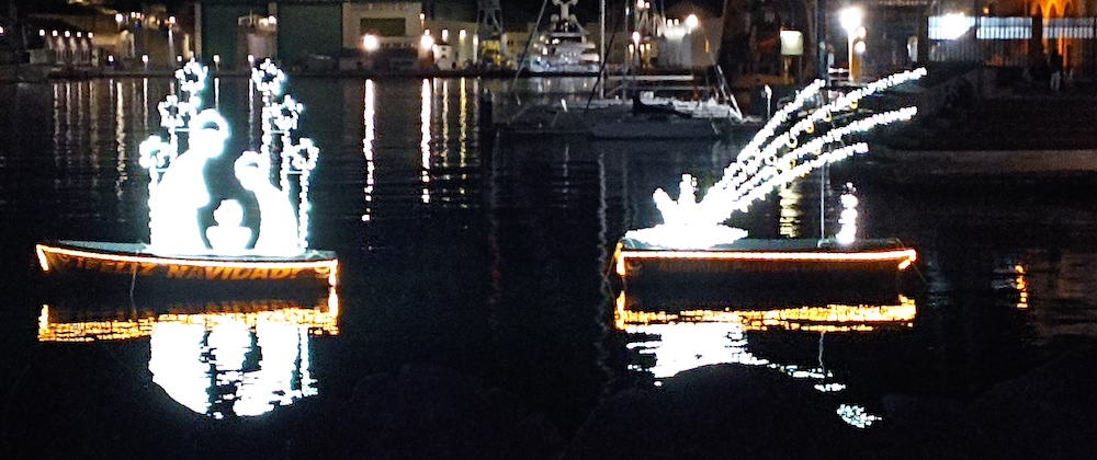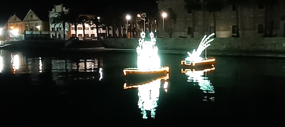 Sobre una barca figura la sagrada familia (Jesús, María y José) y sobre la otra está la estrella de Belén. Las fotos con los móviles son innumerables.