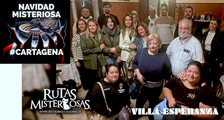 'Rutas misteriosas', la primera red de misterio de España y que en Cartagena coordina Santi García, propone descubrir los días 6, 7, 14, 15, 20 y 21 de diciembre una nueva forma de entender la Navidad, en donde los sucesos extraños, apariciones, psicofonias y encuentros insólitos son los protagonistas. En la foto se ve el cargel anunciador con los participantes en una reciente convocatoria en Villa Esperanza.