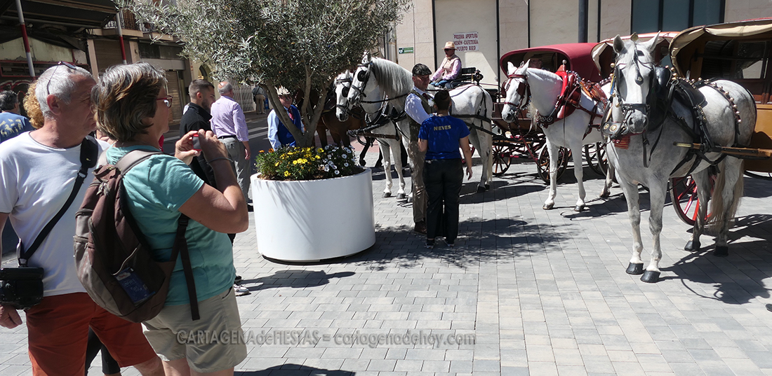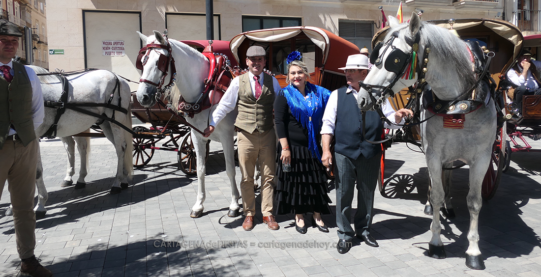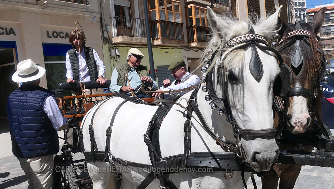 Este fin de semana, una representación del Club de Enganche de Cartagena 'Auriga' han colaborado con el colorido que ha tenido el casco histórico recorriendo diversas calles con cerca de una decena de estos tradicionales vehículos de madera e hierro. Salieron de Los Dolores, haciendo primera escala en el estadio Cartagonova, donde se sumaron otros carruajes, para después avanzar por Alameda de San Antón, plaza de España, calle Real y puerto, donde hubo nuevo alto. Continuaron por paseo de Alfonso XII, Cuesta del Batel, plaza de Puertas de San Jose, calle Duque y 'plaza del Lago', con nuevo estacionamiento. Se reanudó la marcha hacia Capitanes Ripoll, paseo de Alfonso XIII, plaza de España, calle Salitre y plaza de Juan XXIII.