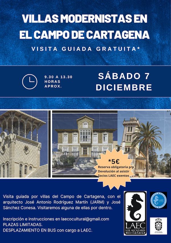 El colectivo Los Alcázares Ecocultural organiza una ruta guiada gratuita el sábado 7 de diciembre por las villas del Campo de Cartagena, algunas de las cuales se podrán visitar en su interior. E arquitecto José Antonio Rodríguez Martín (JARM) y José Sánchez Conesa, integrante del equipo de cronistas oficiales de Cartagena, irán informando sobre estas centenarias construcciones.