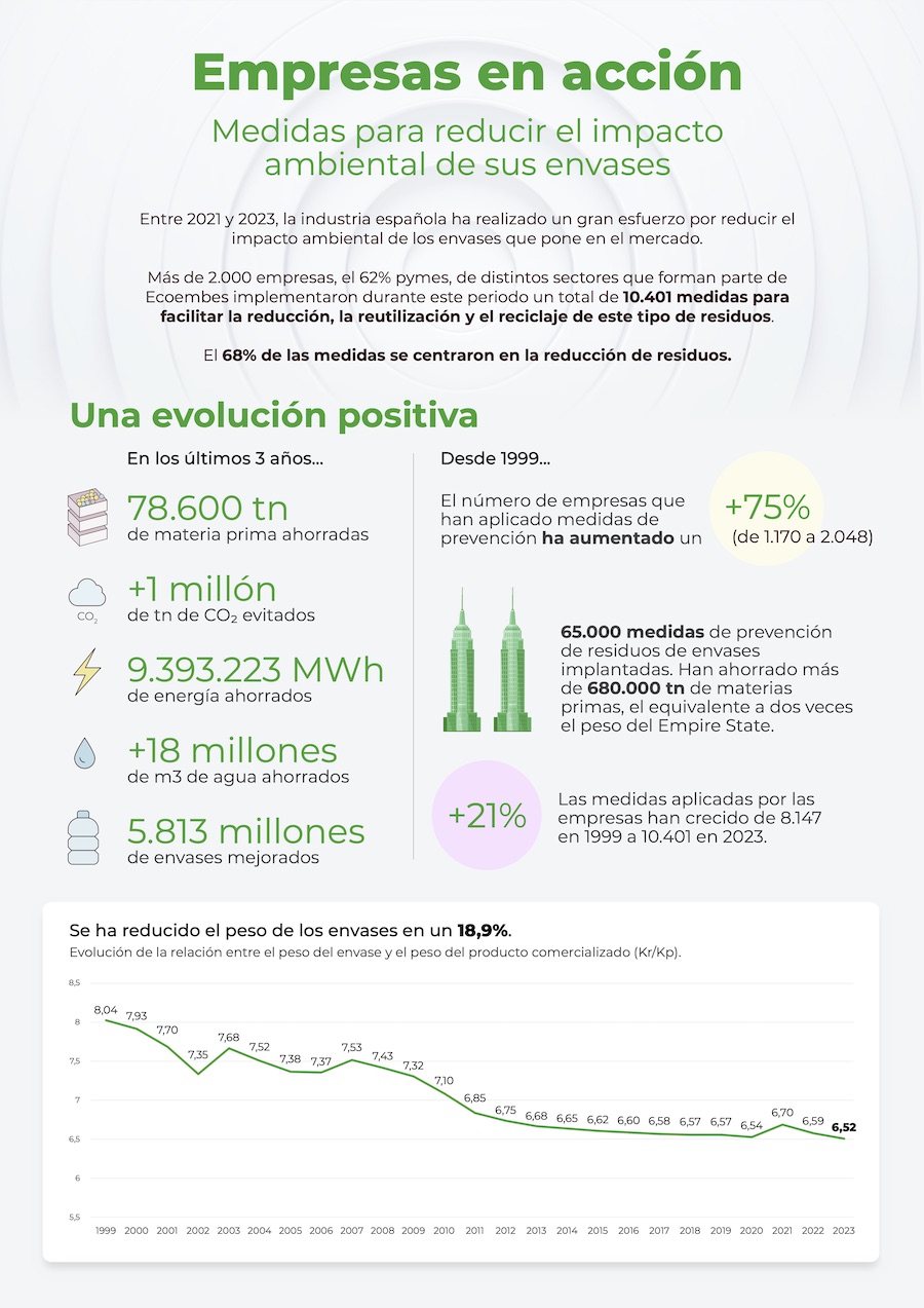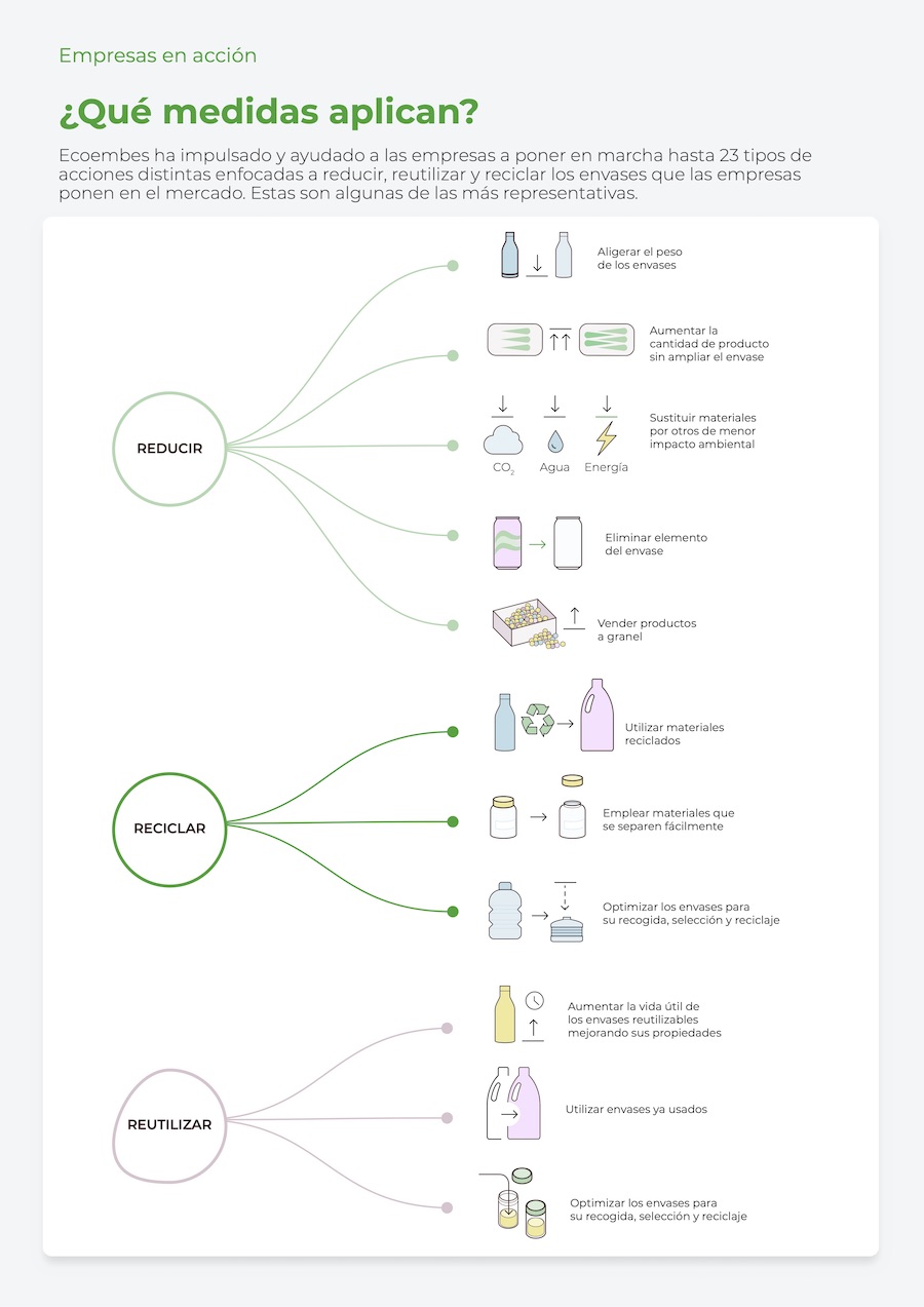 El compromiso de estas empresas queda reflejado en el último Plan Empresarial de Prevención y Ecodiseño (2021-2023) de Ecoembes, periodo en el que han aplicado 375 medidas de ecodiseño. De entre todas ellas, las destinadas a la primera R, la de reducción, han sido mayoritarias: 263 medidas, un 70% del total. Estas medidas de ecodiseño han estado enfocadas al rediseño de los envases, por ejemplo, usando envases con mayor capacidad de almacenamiento; a la disminución de su impacto ambiental, eliminando tintas o barnices o usando materiales procedentes de fuentes renovables; y el menor uso o eliminación de material necesario en su fabricación.