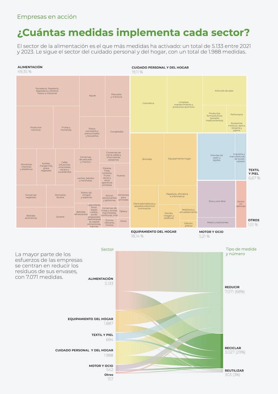 Por tipo de empresas, el 40% de las que han aplicado medidas de ecodiseño son pymes, lo que demuestra sus esfuerzos por, además de cumplir con la normativa, estar más cerca de las peticiones y demandas de los consumidores. Por sectores, el de la alimentación es el que más medidas ha activado: un total de 215 entre 2021 y 2023. Le sigue el sector del cuidado personal y del hogar, con un total de 124 medidas.