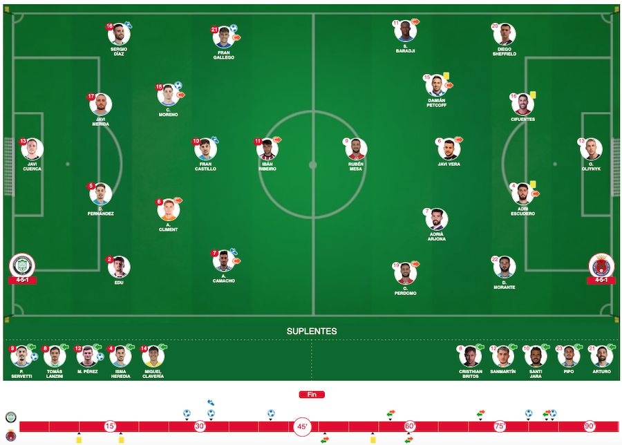 GOLES. 1-0. Minuto 28: Fran Gallego. 2-0. Minuto 32: Fran Gallego. 3-0. Minuto 42: Moreno. 4-0. Minuto 80: M. Pérez. 5-0. Minuto 84: Servetti.