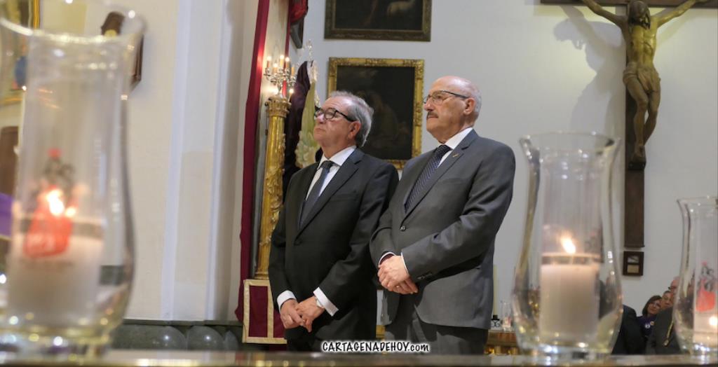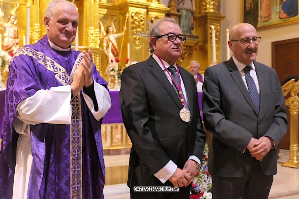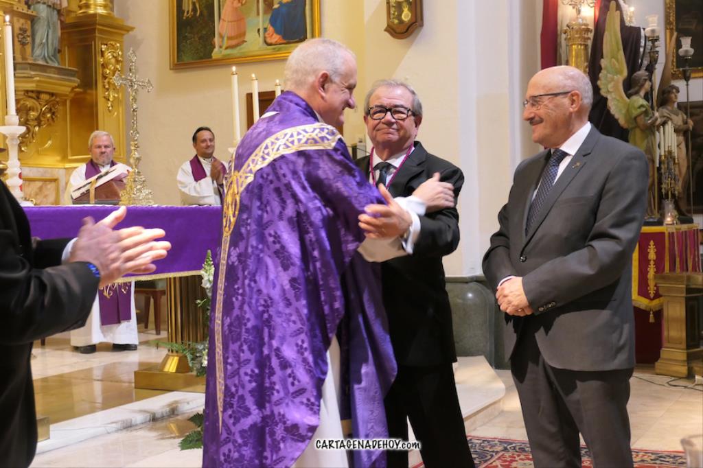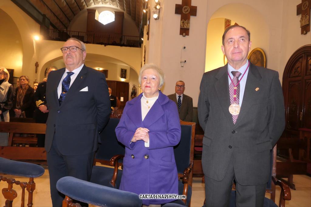 A continuación, Pedro Negroles, como presidente de la asociación Premio Procesionista del Año, le ha impuesto la medalla ante la mirada de medio centenar de personas en una iglesia que ha contado con la presencia de los cuatro hermanos mayores de las principales cofradías pasionarias de la ciudad, de la 'Nazarena mayor' y del edil Pablo Braquehais, entre otros, entre los que se incluyen los dos almirantes de Cartagena, motivo por el que la iglesia ha contado con policía naval en ambas entradas debido a la situación de alerta en la que se encuentra España.