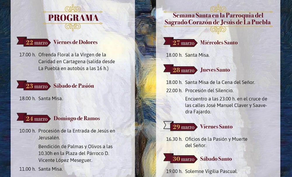 La Semana Santa de La Puebla ya se anuncia a través de la voz y la imagen con el acto celebrado este pasado domingo en la iglesia poblense en el que fue presentada la obra de Rubén como cartel de 2024 después de que Pedro Antonio Fernández ofreciese el pregón del sentir cofrade de esta tierra cartagenera.