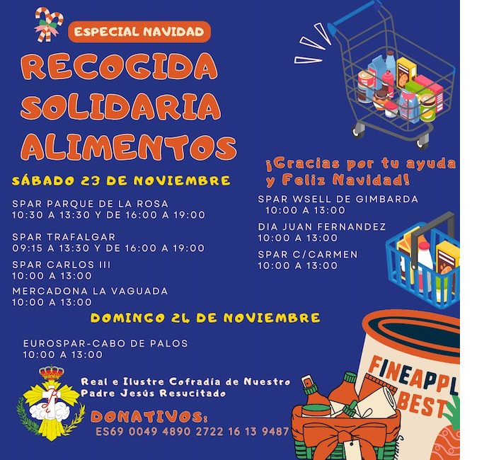 La Cofradía de Nuestro Padre Jesús Resucitado ha organizado un año más, en fechas cercanas a la Navidad, una campaña que este sábado se llevará a cabo de 10 a 13.30 horas en el almacén de tronos e imágenes de la hermandad procesionista en la calle Mahón. Se podrán realizar tanto entregas de alimentos no perecederos como donativos en metálico.