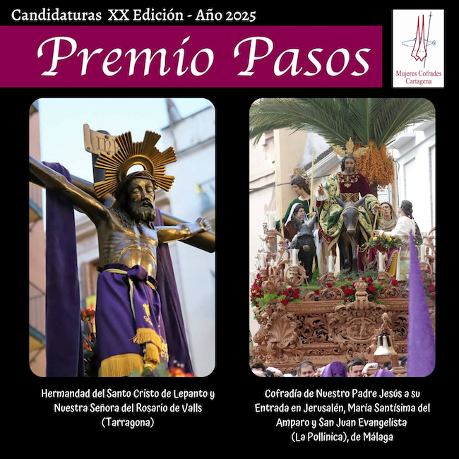 La hermandad del Cristo de Lepanto y Señora del Rosario de Valls (Tarragona) y la cofradía de Jesús a su Entrada en Jerusalén, María del Amparo y San Juan Evangelista (Málaga) son las dos candidaturas presentadas para optar al galardón que concede la asociación de Mujeres Cofrades de Cartagena a las entidades procesionistas que trabajan por la plena igualdad de sexos en el mundo cofrade y que este año cumple veinte ediciones.