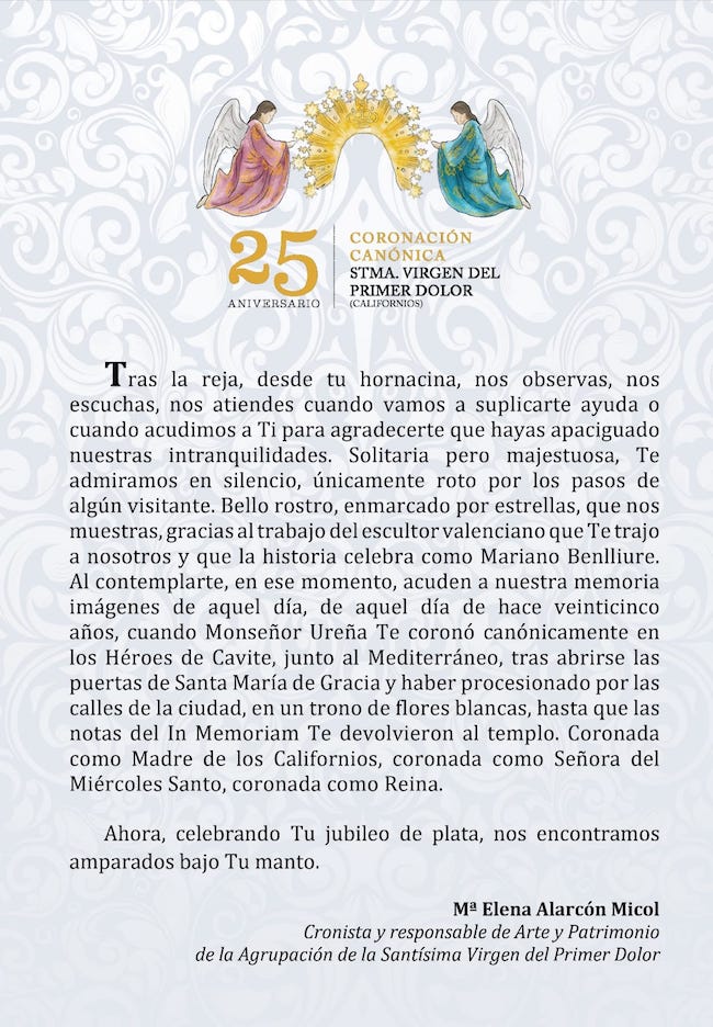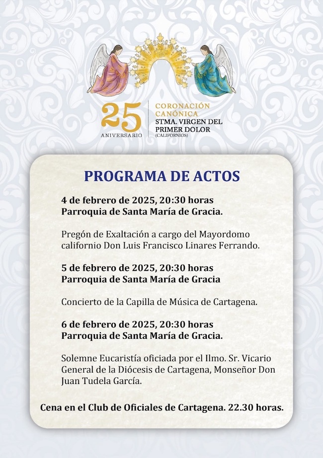El mayordomo será el que ofrezca el pregón de exaltación del 25 aniversario de la coronación canónica de la Virgen del Primer Dolor. El acto tendrá lugar el martes próximo en la iglesia de Santa María, donde al día siguiente habrá un concierto de la capilla de música de Cartagena y el jueves tendrá lugar la solemne eucaristía.