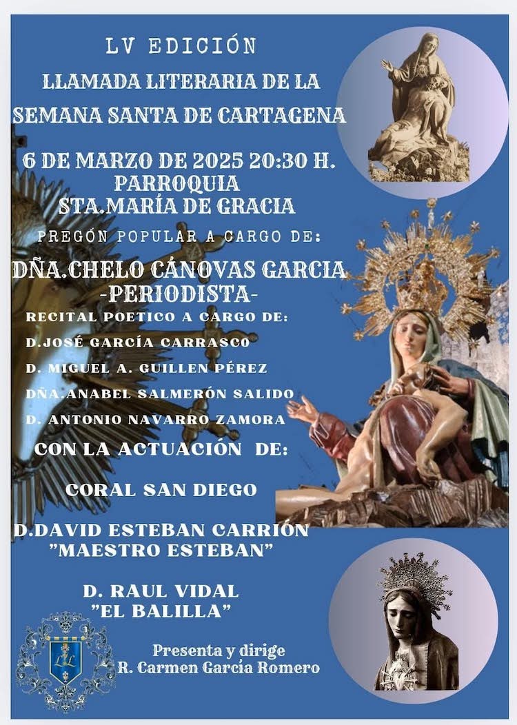 La locutora radiofónica ofrecerá su alocución el 6 de marzo en la iglesia de Santa María en una 55 edición que estará dedicada a la Virgen de la Piedad en el centenario de la llegada a Cartagena de la imagen que talló José Capuz. El acto reunirá a cuatro poetas y en su apartado musical contará con la coral de Sasn Diego, con David Esteban Carrión 'Maestro Esteban' y el artista flamenco 'El Balilla'. Carmen García Romero será la presentadora de la velada en Santa María, con entrada gratuita.