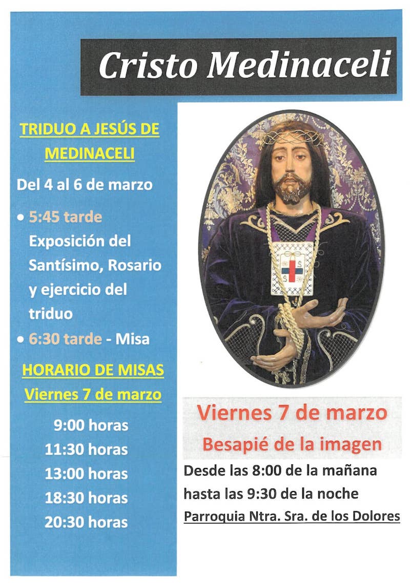 La iglesia de Santa María estará abierta más de quince horas para acoger las miles de personas que acudirán a venerar a la imagen marraja de la asociación piadosa, mientras que el 'Cristo del Lago' regresa a la basílica de la Caridad para recibir a sus devotos. La iglesia de Los Dolores también estará todo el día sin cerrar para venerar a la imagen en el final del triduo y en la parroquia urbana de Santo Domingo será el tercer año en el que Jesús del Rescate reciba a sus fieles.