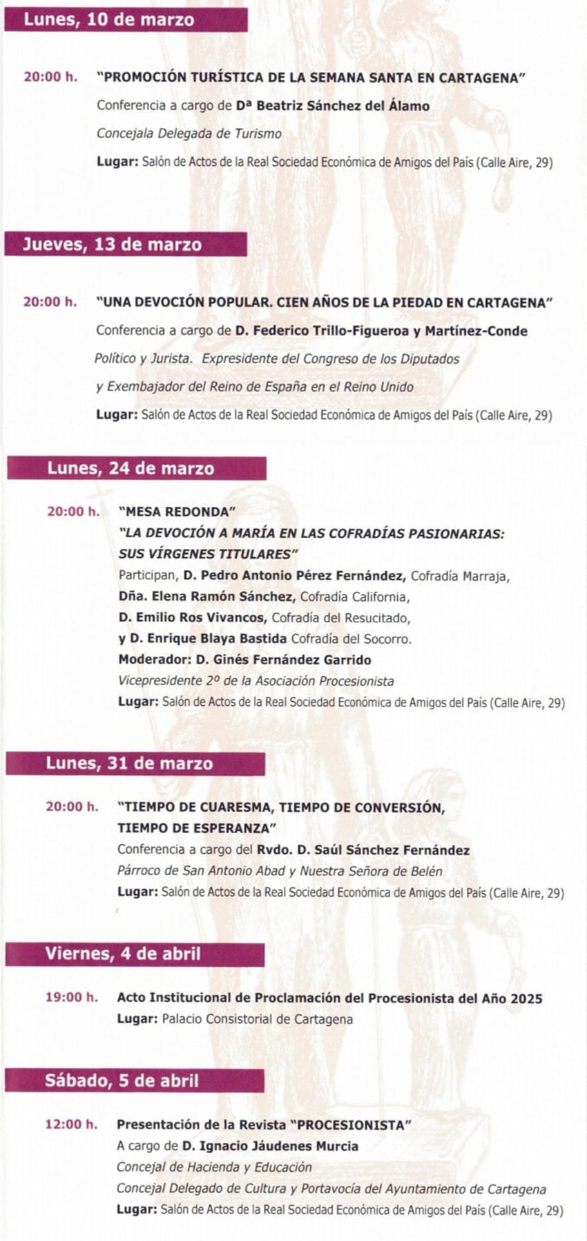 El jueves será el turno el que fuera presidente del Congreso de los Diputados y Embajador del Reino de España en el Reino Unido, el político y jurista Federico Trillo-Figueroa; quien dará una ponencia bajo el título: “Una devoción popular. Cien años de la Piedad en Cartagena”.