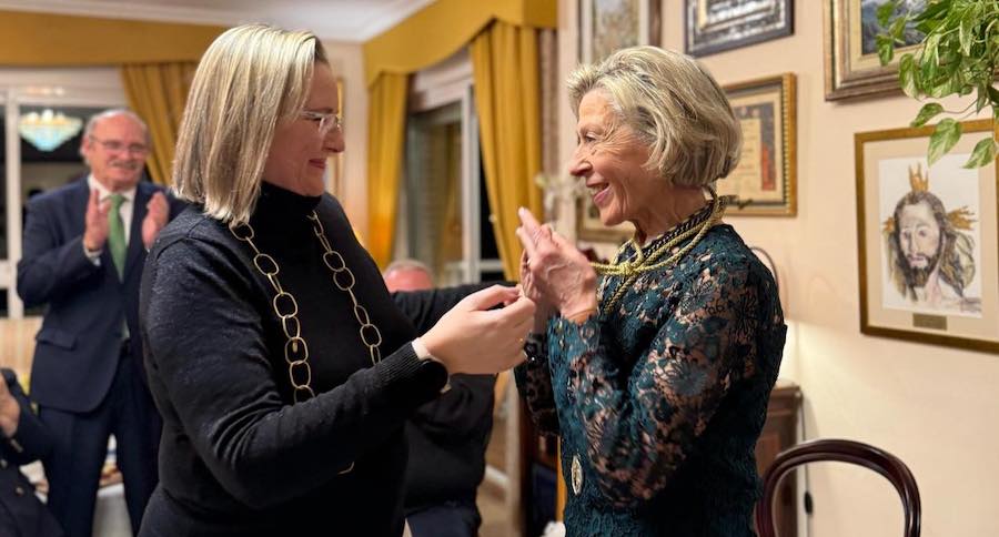María Ángeles Valverde Ruiz ha recibido en su domicilio a la alcaldesa de Cartagena y a los hermanos mayores de las cofradías del Nazareno, del Prendimiento, del Socorro y del Resucitado, quienes le entregaron las medallas de las hermandades.