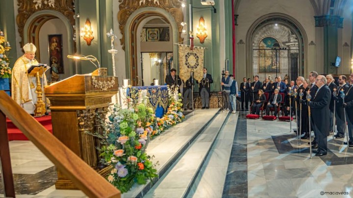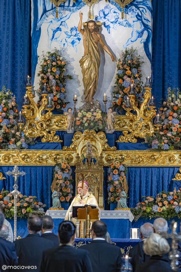 La Cofradía de Nuestro Padre Jesús del Resucitado celebró su principal acto litúrgico de cada año, el cual fue oficiado por el obispo, monseñor Lorca Planes, y ofreció, además del engalanamiento floral, el novedoso adorno de altar con elementos del trono dorado del titular, el estreno de un incienso que será exclusivo para este oficio.