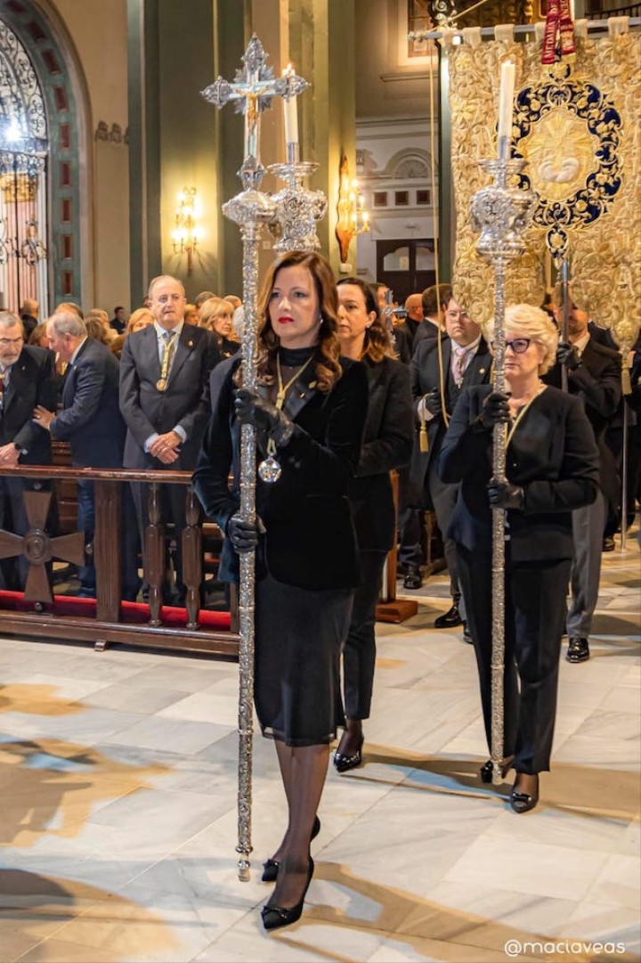 A los pies del altar se ha colocado un sagrario de estilo neogótico, cedido expresamente para esta ocasión, y un delicado exorno floral a cargo de Floristería Flori, que ha empleado una selección de flores dispuestas en piñas sueltas, evocando el estilo clásico de los cultos de antaño. También se han incorporado elementos textiles de gran valor, como las bambalinas del palio de la Santísima Virgen del Amor Hermoso, que han sido sometidas a un proceso de limpieza, recuperando su esplendor original.