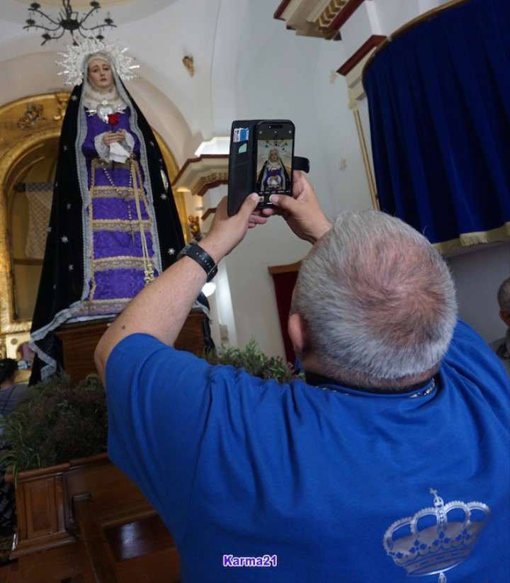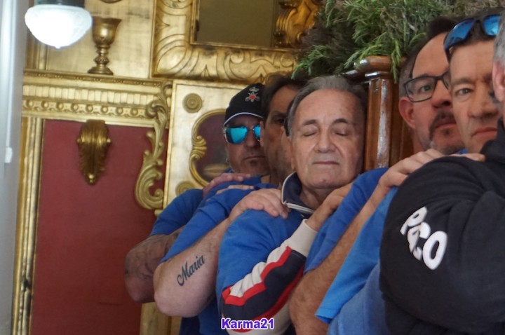 Mientras, de forma paralela, en la puerta se informa a los que quieran acompañarla que deberán ir siempre detrás del trono, en el que lucen el tomillo y el romero que en la misma mañana han recogido los hermanos de la cofradía. En concreto, cinco sacos. Reseñar que entre los que visitan a la Virgen antes de salir figura la madrina de este año, Emilia Gallego Soto.
