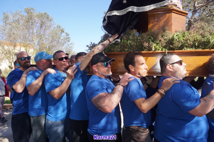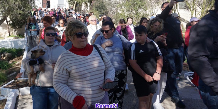 Por segundo año, el cortejo se adentró en el cementerio de los Remedios para tener un emotivo recuerdo, "para rezar por los que nos faltan", expresa un portapasos. Poco antes, y una vez culminado el descenso, han sido mujeres quienes ha relevado a los varones bajo las peanas. Además, el adorno se neriquece entonces con eucalipto y espumilla.