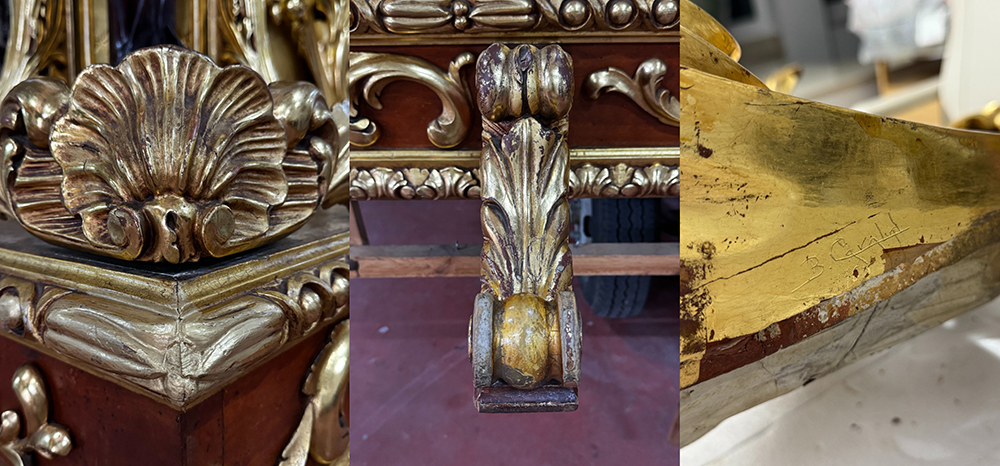 Finalmente, se ha conseguido localizar la firma del dorador Bartolomé Carabal García en algunas de las piezas decorativas exteriores desmontadas y las iniciales del grupo de tallistas y operarios en la viga central que compone la estructura interna del trono.