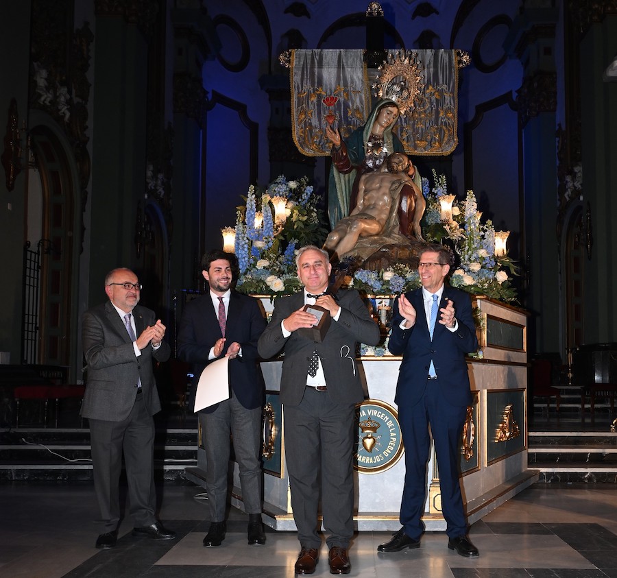 El concejal del Área de Hacienda y Educación del Ayuntamiento de Cartagena, Ignacio Jaúdenes; el Hermano Mayor marrajo, Francisco Pagán y el presidente de la Agrupación de Portapasos Promesas de la Stma. Virgen de La Piedad, José Jesús Guillén, han entregado al gaditano este primer premio dotado con 3.000 euros de la Cofradía Marraja, con un trofeo-escultura realizado por el escultor Fernando Saénz de Elorrieta y diploma.