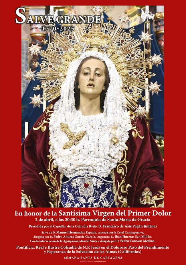 La solemne eucaristía en honor a la Virgen del Primer Dolor, que anoche fue trasladada hasta el altar mayor de la iglesia de Santa María por los mayordomos más antiguos dela hermandad, comenzará a las 20.30 horas y será presidida por Francisco de Asís Pagán Jiménez, capellán de la Cofradía California. La Salve de Manuel Hernández Espada será cantada por la coral Carthagonova, bajo la dirección de Pedro Andrés García, con Ibán Huertas como organista.
