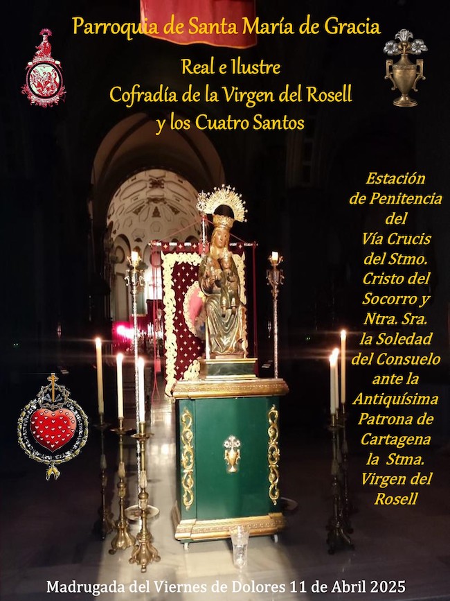 La Cofradía de la Virgen del Rosell y los Cuatro Santos de Cartagena recuerda a la ciudadanía que, en la madrugada del Viernes de Dolores, el Vía Crucis del 'Cristo Moreno' y la Soledad del Consuelo hará la tradicional estación en su recorrido ante la talla, con entrega floral y se cantará, por vez primera en Semana Santa, la Salve cartagenera.