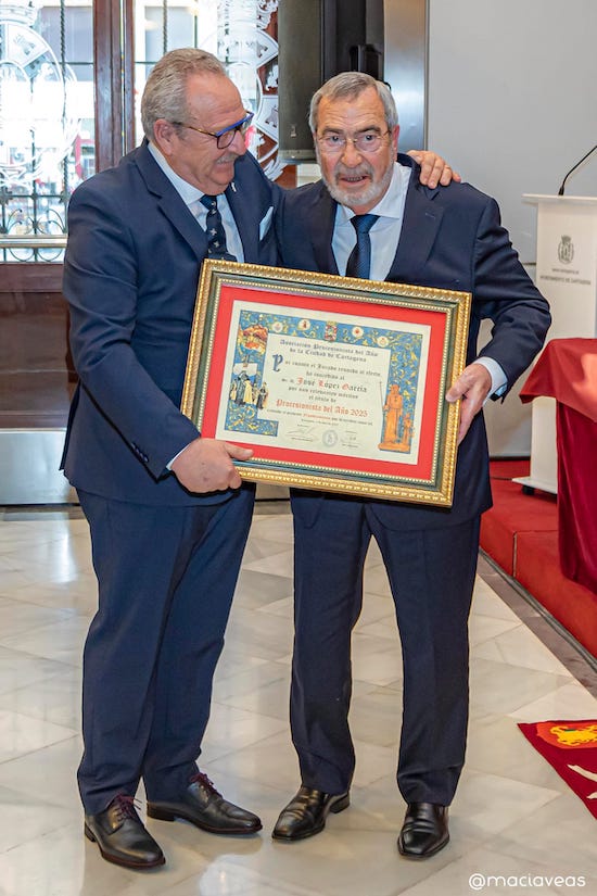 El hall del Palacio Consistorial acogió en la tarde del viernes el acto institucional de entrega del título de Procesionista del Año 2025 al cartagenero José López García, en una ceremonia presidida por la alcaldesa de Cartagena, Noelia Arroyo, y el presidente de la Asociación Procesionista del Año, Pedro Negroles.