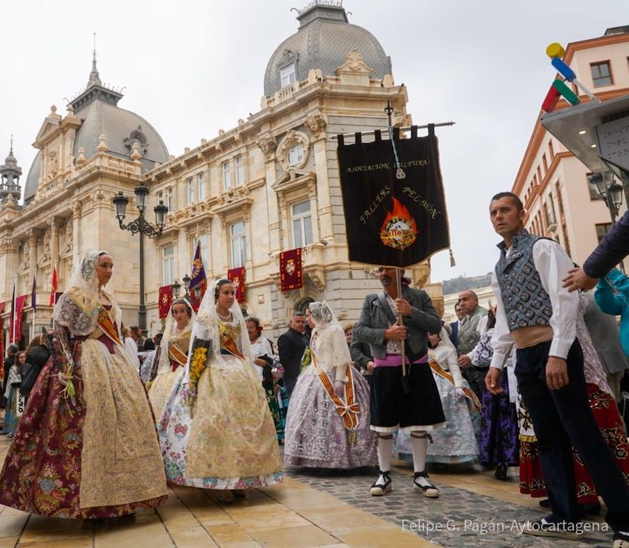 El popular desfile de unas tres mil personas en 57 colectivos con destino a la Caridad para agasajar con flores y bailes a la patrona de Cartagena ha contado con una representación de falleras procedentes de Valencia que han querido mostrar su gratitud por las ayudas que tuvieron de esta tierra en la tragedia de la DANA del pasado año.
