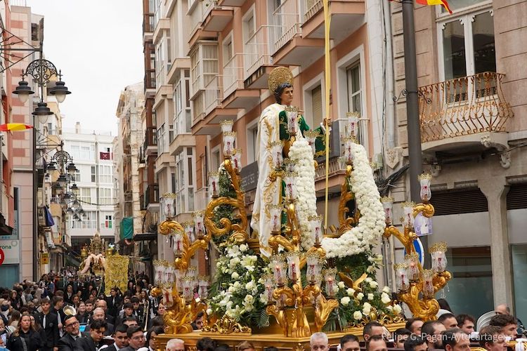 El vía crucis de la Divina Misericordia cruzó el 'corazón' de Cartagena con un desfile cargado de novedades, pues, además de la conversión de la asociación en hermandad oficial, hubo nuevo vestuario de San Juan (también recuperó la cruz de Malta) sobre un trono que ha culminado su restauración, además de que José Felipe Rubio acabar de pasar de presidente a hermano mayor y que se ha nombrado a Eduardo Conesa como 'presidente honorífico'. En la foto, María de los Desamparados, que estrenó estandarte.