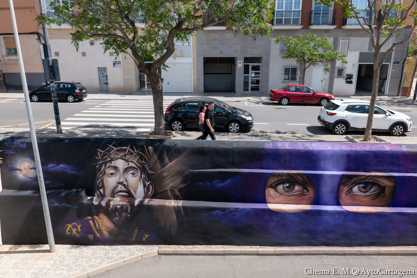 Este mural dedica una especial relevancia a la imagen de Nuestro Padre Jesús Nazareno de la Cofradia Marraja que en la madrugada del Viernes Santo procesiona desde la Pescadería hasta la iglesia de Santa María, pasando por la plaza del Lago, donde se realiza el tradicional Encuentro, uno de los momentos más característicos de la Semana Santa de Cartagena, declarada de Interés Turístico Internacional.