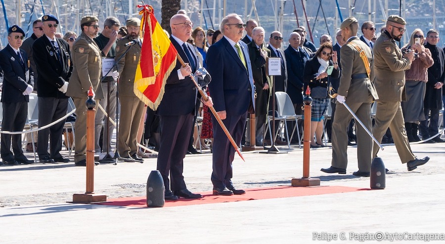 La explanada del puerto ha recogido la donación en un acto solemne para conmemorar este día en el que los militares del Regimiento de Artillería Antiaérea 73 han desfilado por las calles de Cartagena próximas al mar.
