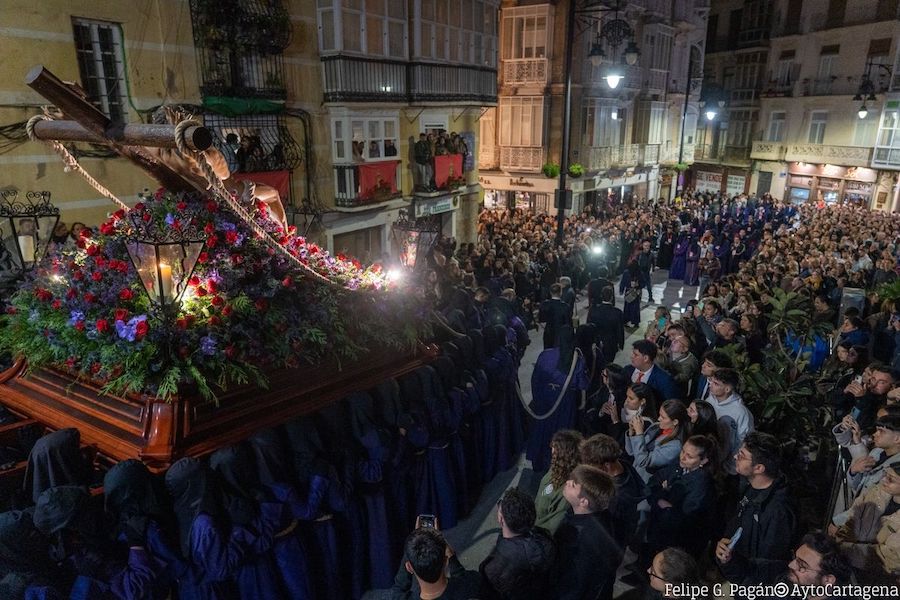 El vía crucis del Cristo del Socorro y la Soledad del Consuelo, que rememora los cortejos pasionarios de los siglos XVII y XVIII, cuando no existía el típico orden del desfile cartagenero, ha llenado de público las calles del casco histórico.