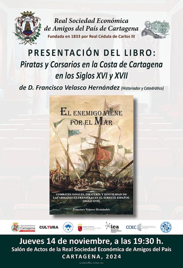 LIBRO. 'Piratas y corsarios en la costa de Cartagena en lso siglos XVI y XVII', escrito por el historiadora y catedrático Francisco Velasco Hernández. Salón de actos de la Real Sociedad Económica de Amigos de País. 19.30 horas. Entrada gratuita.