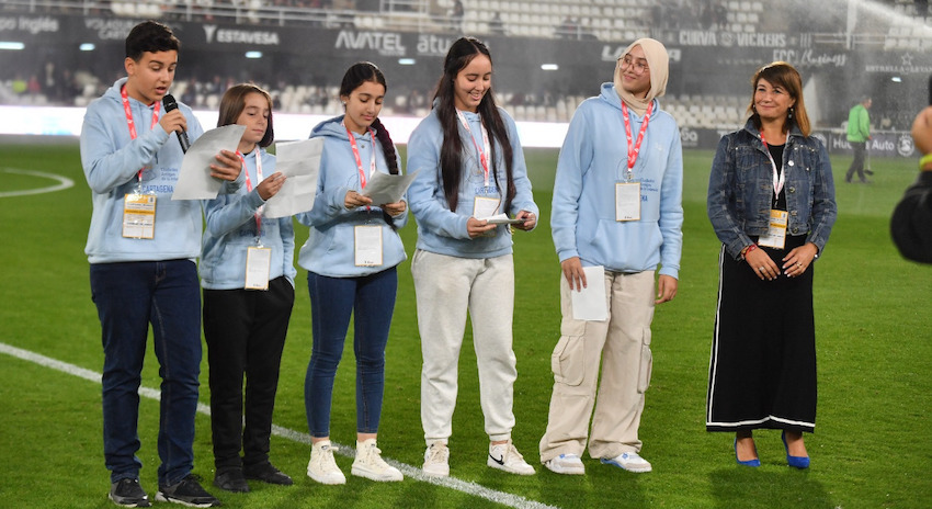 Los jóvenes Saúl, Nico, Hanane, Zainab y Sara, acompañados por la concejala del área de Política Social, Igualdad y Familia, Cristina Mora, han dado lectura a un extracto del manifiesto del 20N, que ha concluido con el aplauso de la afición congregada en el estadio.