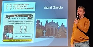 Santi García estará en las primeras jornadas 'Raíces y legado. Un encuentro intergeneracional', que el próximo sábado tendrá lugar en la Casa de Cantabria de la capital de España. En la foto se le observa en una reciente conferencia sobre 'La vida en los cementerios del sureste' que ofreció en un acto organizado en E Retiro madrileño por la 'Sociedad Española de antropología y tradiciones populares'.